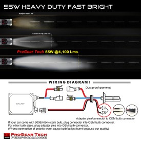 Description: JP-ProGear 55W AC HID Conversion Kits are the best choice for consumers when comparing quality & pricing. It features countless protective measures and technologies derived from the most popular OEM benchmarks. The slim (16 mm) die-cast aluminum shell body can fit anywhere under the hood, silicon sealed circuit board; eliminating any chance of moisture damage. Quartz ArcTM UV-StopTM A grade burner which provides perfect projection of light. Installation is a breeze, with the OEM fitment Plug and Play connectors and simply follow installation guide included in every box and you'll understand how easy our Plug and Play works. Let's not forget the 2-year warranty. The kit is designed to run for at least 5000 hours and there's not much that will stand in their way.